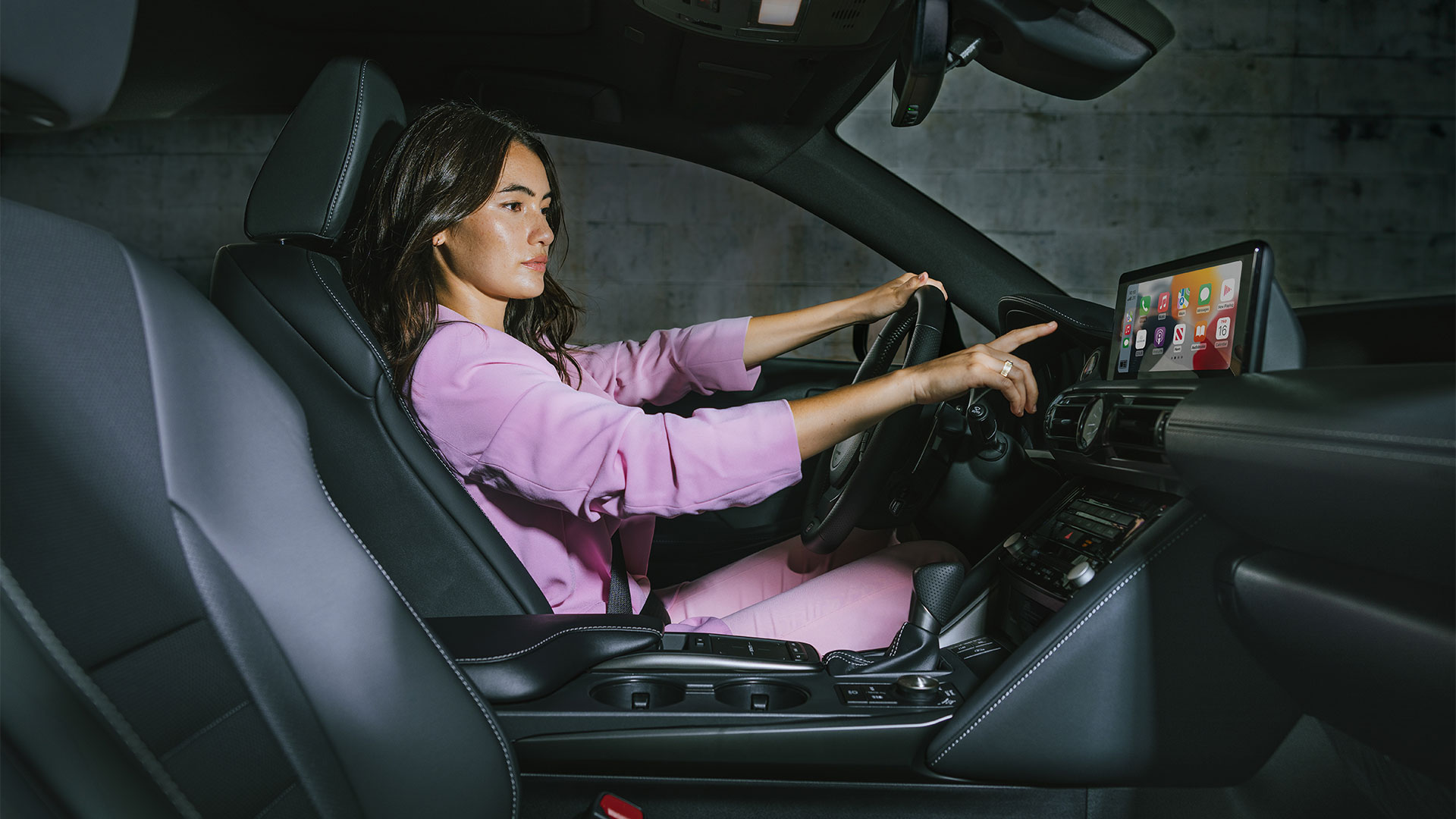 A convenient touchscreen display. A shift knob and steering wheel trimmed in supple leather. Daring details like accent stitching along the dash and larger, circular air vents reminiscent of jet turbines. Every interior element is centered around you.